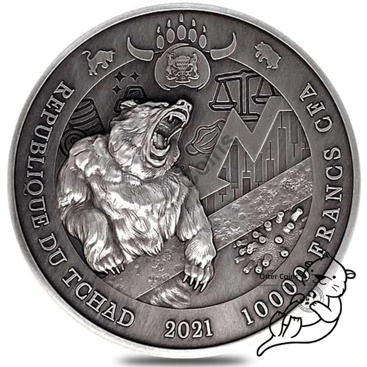 Chad 2 oz Silber Bull vs. Bear Antik High Relief Coin 2021