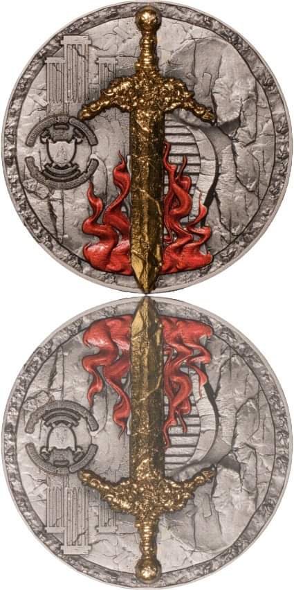Cameroon Excalibur 2025, Shaped, Antik, Emanel, 2oz Silbermünze Acryldisplay***