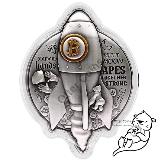 2022 Chad 1 oz Bitcoin Rocket Shaped Antiqued High Relief Silbermünze*